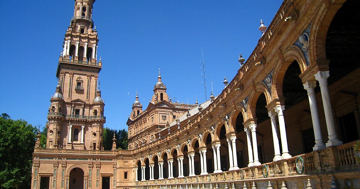 Внутри «Парка Марии Луизы» площадь Испании является одной из самых удивительных вех Севильи, словно ее величие и слава. Колоссальный двор площадью 50 000 квадратных метров окружают перила балконов здания в неомавританском стиле эпохи Возрождения.Гости по достоинству оценят комфортную прогулку по парку, находя по пути окутанные изумления, например, озера и строения. Парк находится недалеко от водного пути, на территории растут очаровательные пальмы, апельсиновые деревья, вязы и средиземноморские сосны. Изысканные примечательные конструкции и ярко выложенные плиткой сиденья дополняют чудесный климат вместе с причудливыми бассейнами.