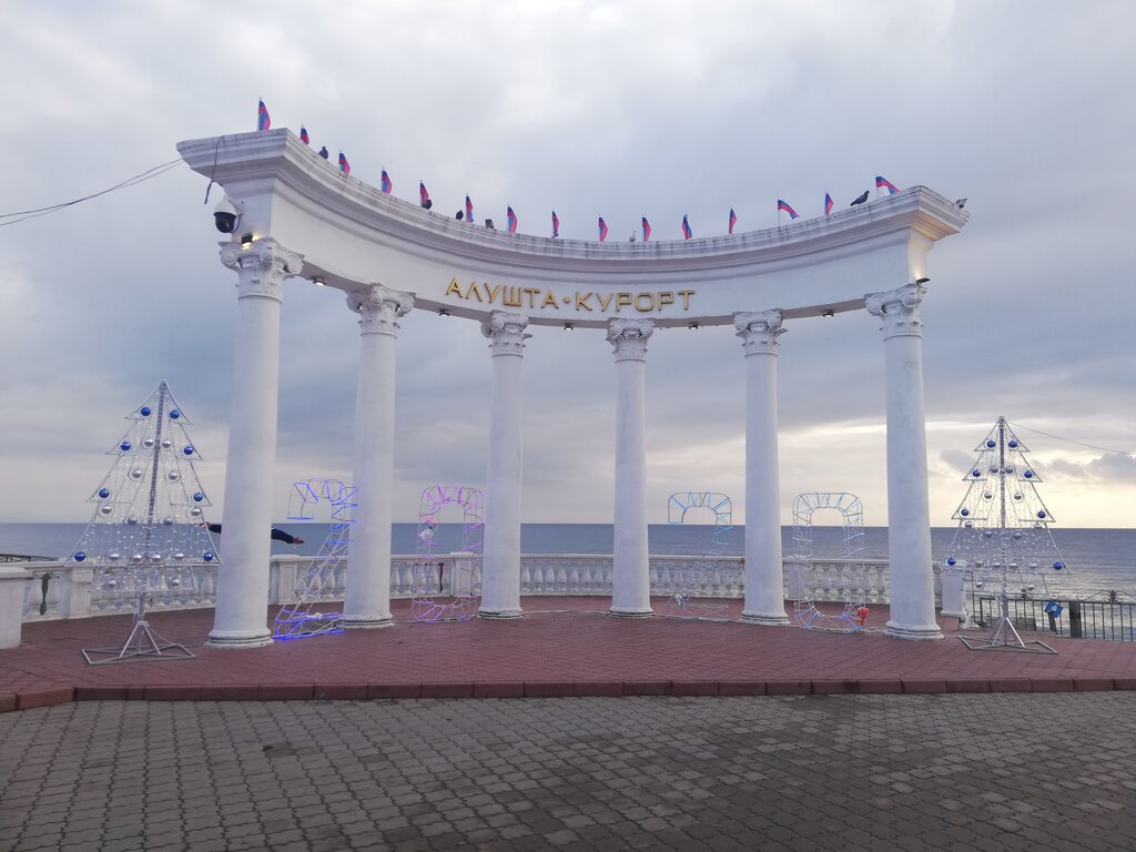Алуштинская ротонда с надписью: «Алушта-курорт», состоит из 6 колонн коринфского ордера. Он был установлен в послевоенное время (1951 г.), когда набережная была благоустроена после разрушений, нанесенных ей оккупацией и многочисленными боями за Алушту.
