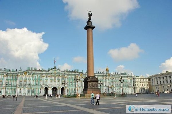Композиционным центром Дворцовой площади является памятник Александру I – Александровская колонна с венчающим её ангелом. Это самая высокая триумфальная колонна в мире. Её высота 47,5 метров. Вес гранитного монолита – более 600 тонн. Он стоит на пьедестале только за счёт точного инженерного расчёта и собственного веса.