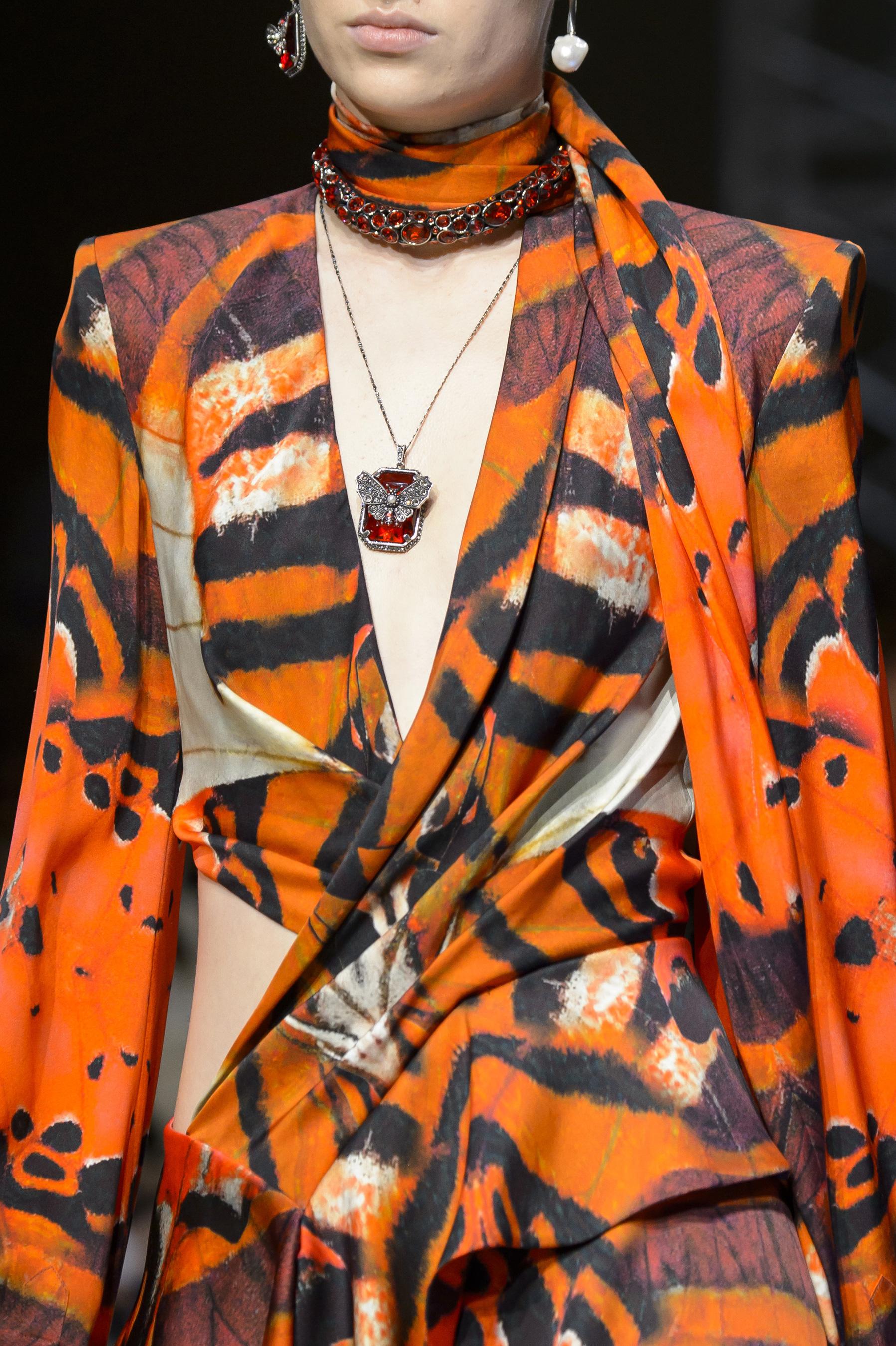 Дизайнер Сара Бертон , которая осталась верной первоначальному видению Маккуина, хотела, чтобы женщины чувствовали себя сильными и даже защищенными. Работая над темой фетишизма, она сосредоточила свою эстетику на уникальном взаимодействии между уязвимостью и силой, сочетая принты в виде крыльев бабочки с шокирующей кожей.