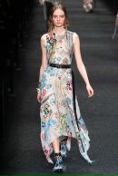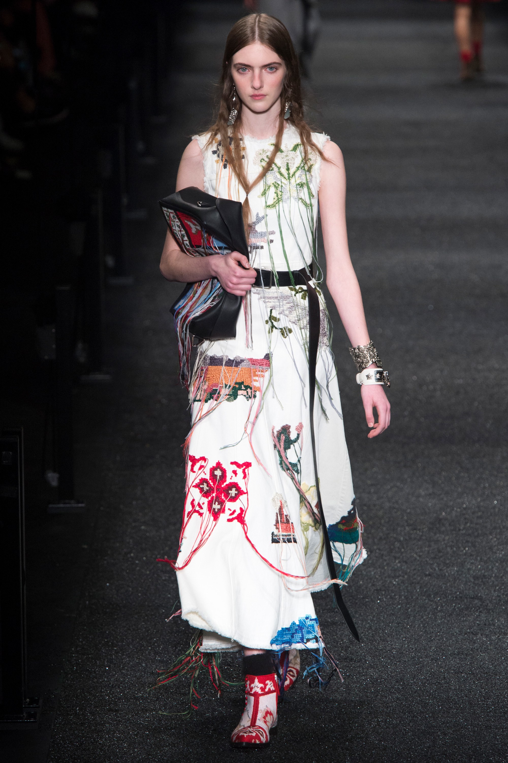 Но не цветами едиными примечательна новая коллекция Alexander McQueen, в ней нашлось место и любимому МакКуином гранжу: его добавили нарочито грубые ботинки (тоже, впрочем, украшенные цветами), плотный деним, сумки с заклепками и необычные прически — волосы моделей звездный стилист Гуидо Палау убрал за колье и чокеры, а несколько прядей вынес вперед, так, чтобы они спускались прямо по лицу.