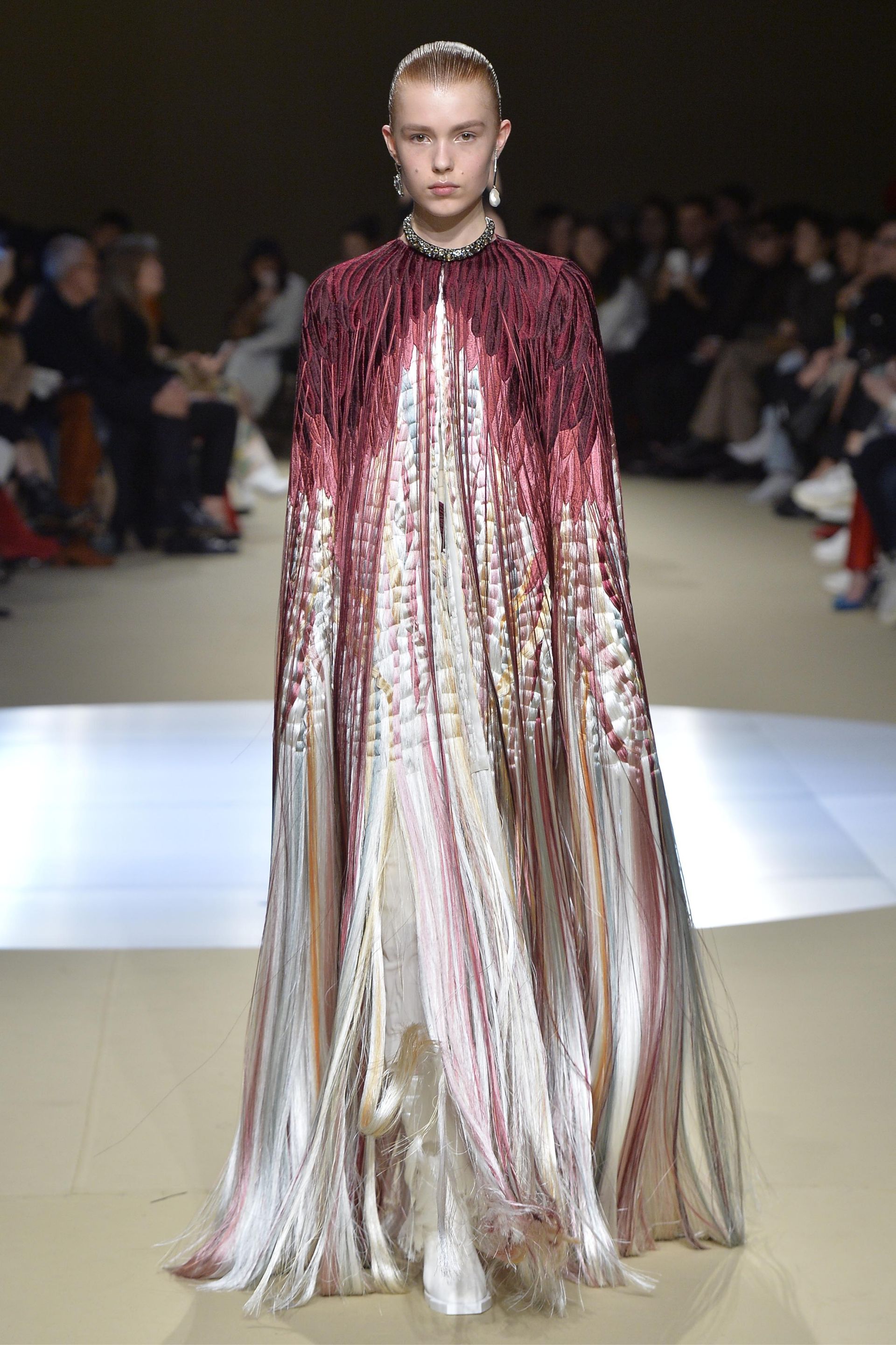 Одна особенная эффектная накидка превратила принт в плотную бахрому. Еще один вау-момент прошел по подиуму, отрастив перьями и полностью обрамленный бахромой, а затем последовало черное платье с красной бахромой, похожее на райскую птицу.Сейчас никто не делает бахрому лучше, чем МакКуин — можете на это поставить. Затем последовали гибридные коктейльные платья-блейзеры с большими розовыми оборками на плече, напоминавшие взлетающие крылья. Все это было идеально сбалансировано между мягким и жестким, светлым и темным, хрупким и суровым — послание, которое исследовало и защищало двойственность женщин.