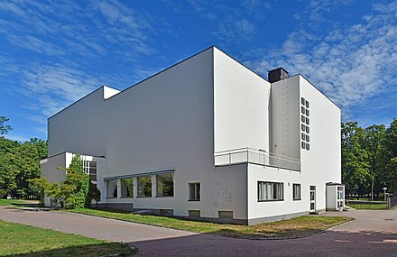 Белоснежное здание, состоящее из четких геометрических объемов, с ленточным и панорамным остеклением, с металлическим рейлингом на разноуровневой крыше, как и многие другие здания модернизма, напоминает огромный океанский лайнер.