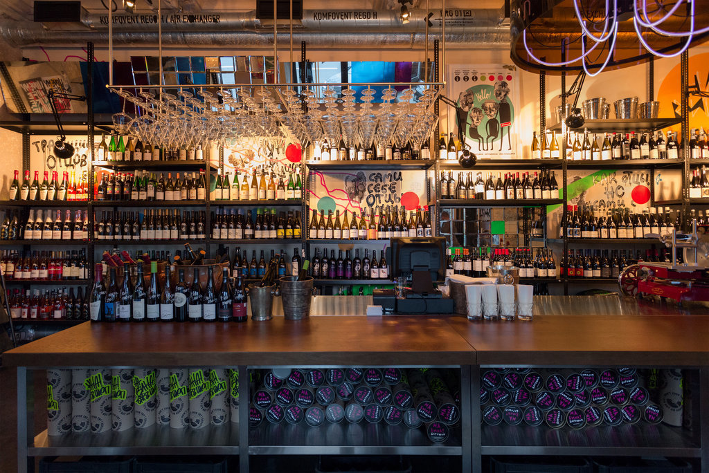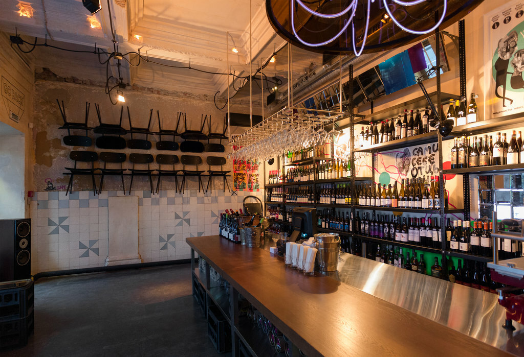 Отвечавший за дизайн нового бара Александр Богодух полностью сохранил аутентичность пространства, не меняя планировку и не меняя фактуры стен, потолков и пола, и так в буквальном смысле пропитанного винным духом – за сто с лишним лет-то. На нынешней территории Центра современного искусства вина разливали, как известно, аж с 1889-го, когда некие купцы Травниковы здесь основали Московский комбинат виноградных и десертных вин. Они, кстати, не только выпускали собственный продукт, но и маркировали здесь вина, привезенные из Крыма.