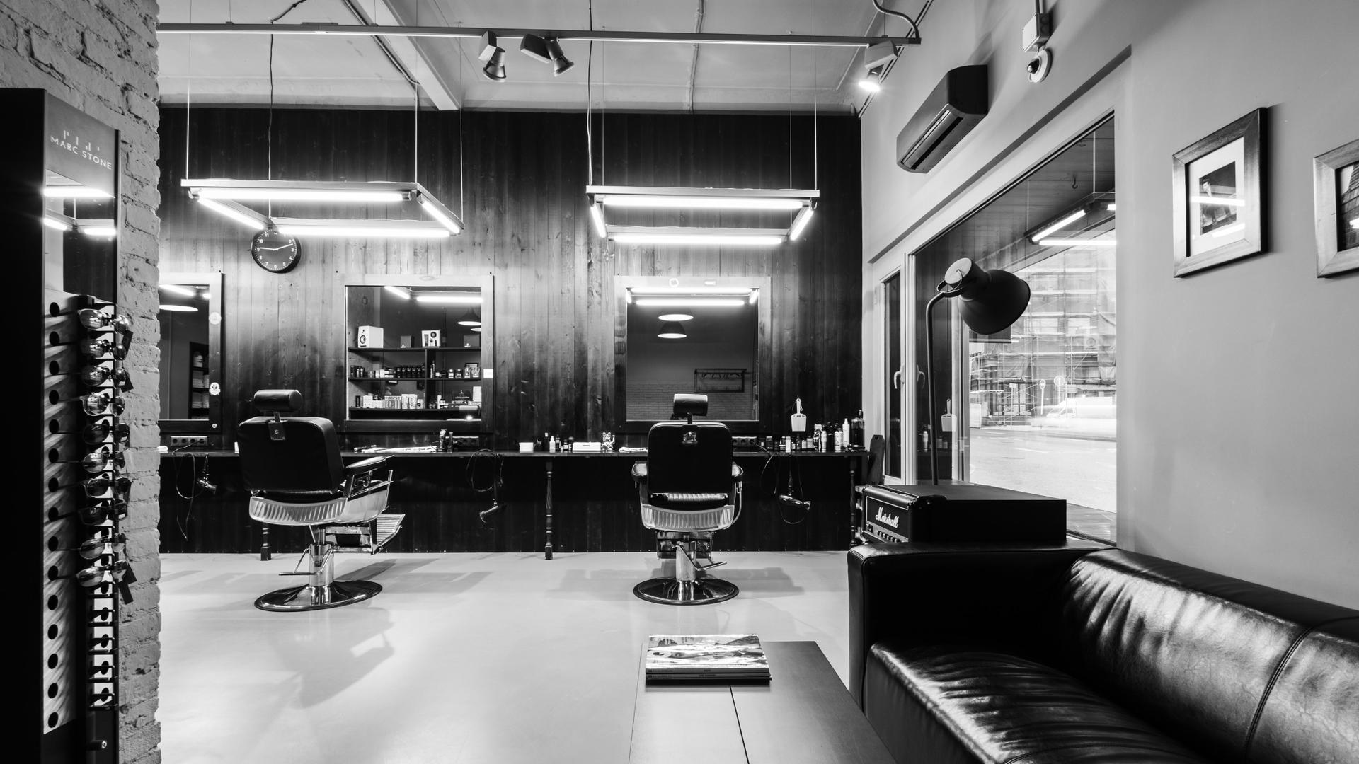 Все помещение разделено на несколько зон, несколько отличающихся друг от друга в плане отделки. В более светлой части зала находятся клиентские кресла и, соответственно, рабочие места специалистов. Стены парикмахерской отделаны белой керамической плиткой, которая комбинируется с серо-голубыми элементами из древесины. Места для ожидания и отдыха характеризуются приглушенным освещением, на стенах есть грубый кирпич и темная древесина. Помещения дополнительно декорированы чучелами животных, настоящими байками с хромированными элементами. Для ожидающих предусмотрены мужские журналы, чай, кофе, виски или пиво.