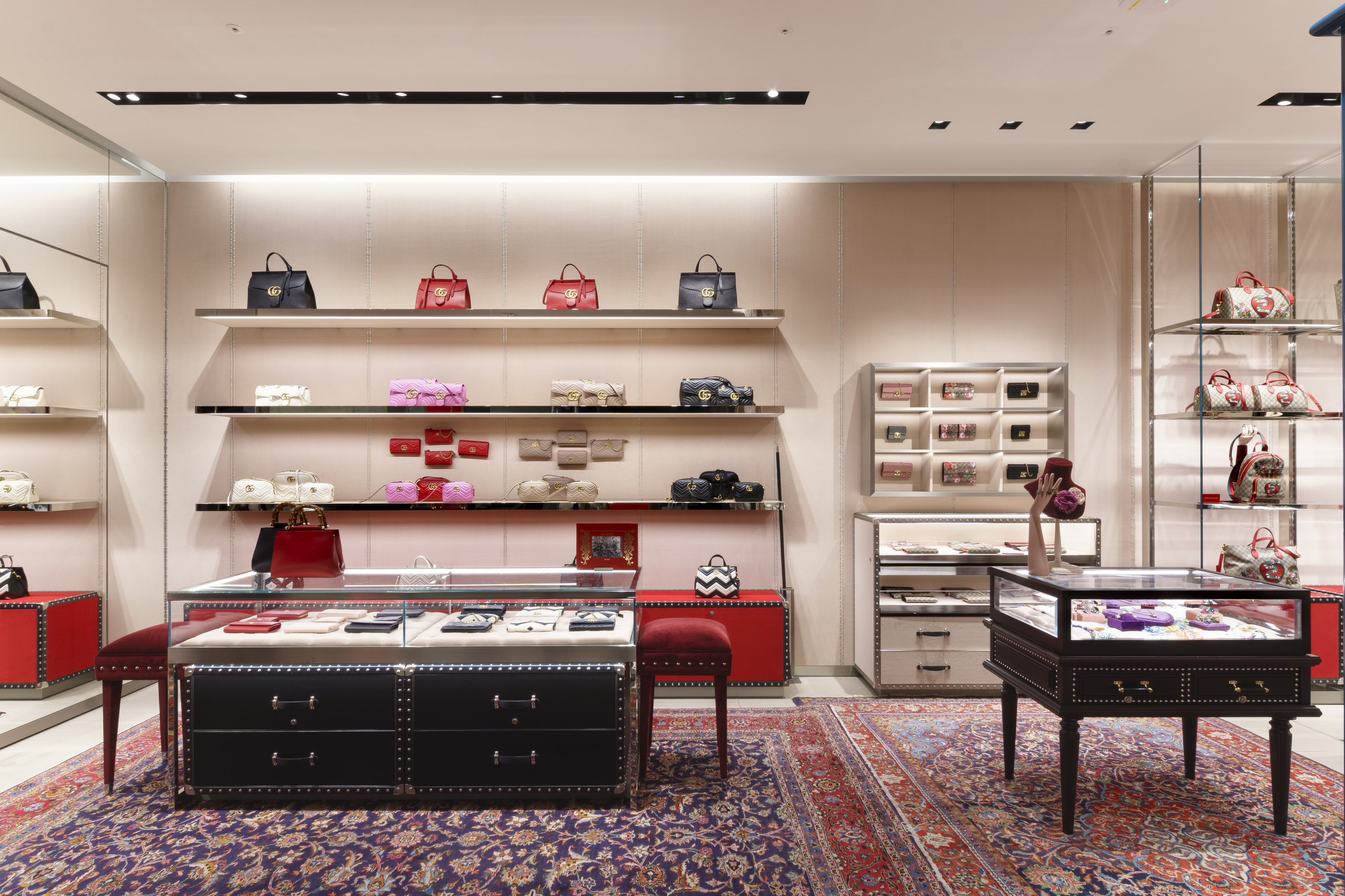— Концепция интерьера — это сочетание современных архитектурных решений и культовых материалов, которые ранее использовались при декорировании магазинов Gucci». На первом этаже нового бутика представлены легендарные аксессуары дома, давно ставшие объектом желания множества модниц во всех уголках земного шара. На втором продается одежда и обувь для мужчин и женщин, а также шелковые изделия, которыми Gucci известен не меньше, чем своими знаменитыми сумками. В честь открытия бутика в ГУМе дом Gucci представил эксклюзивную женскую коллекцию, в которой преобладают жемчужный, черный, белый и серый цвета и традиционные силуэты: брюки-клеш, юбка-карандаш, коктейльные и вечерние платья, а также вещи из каракуля, норки и экзотической кожи.