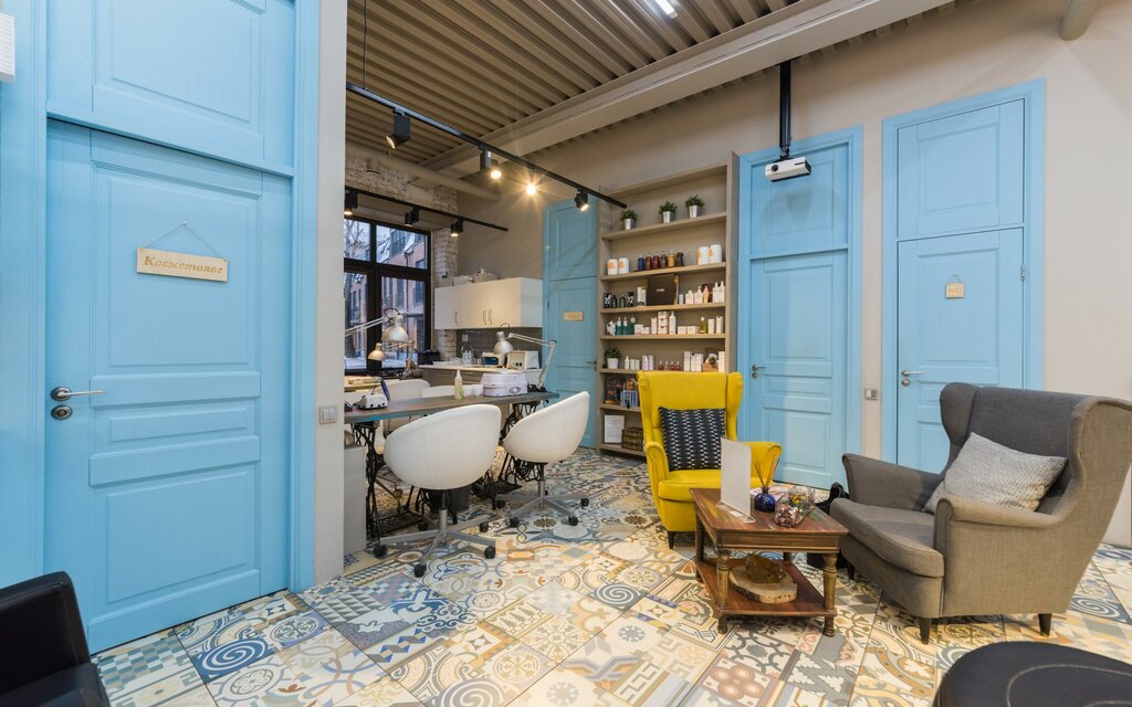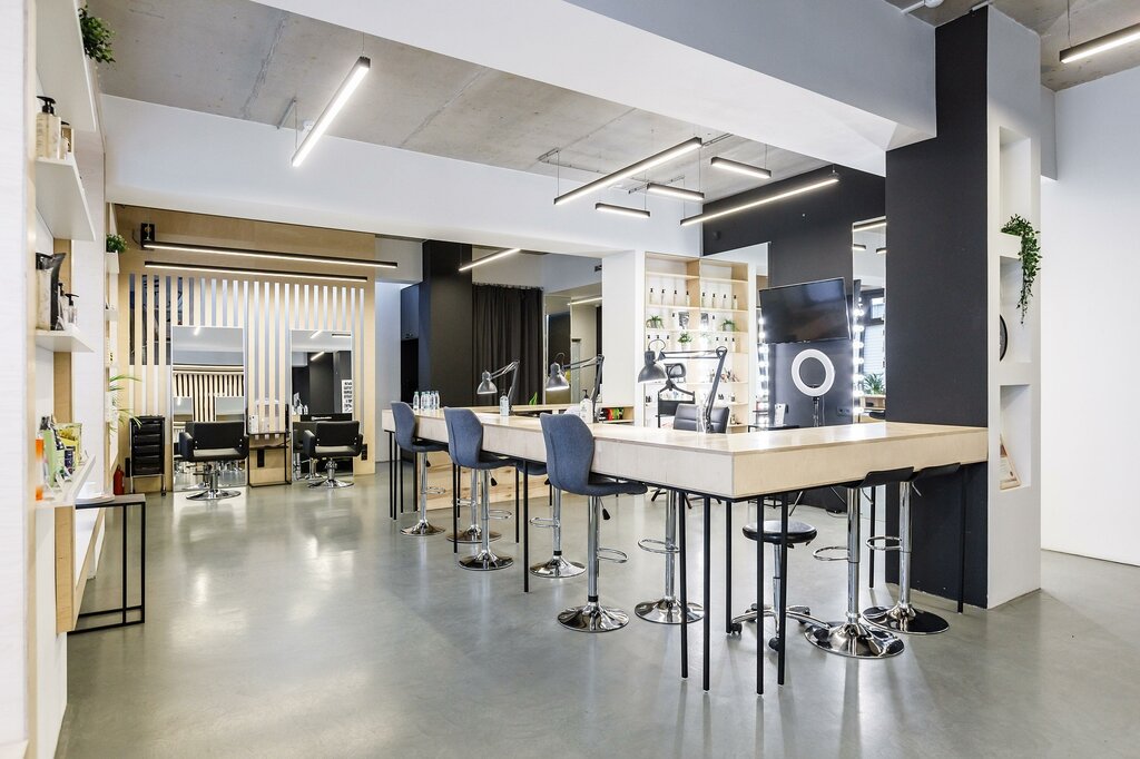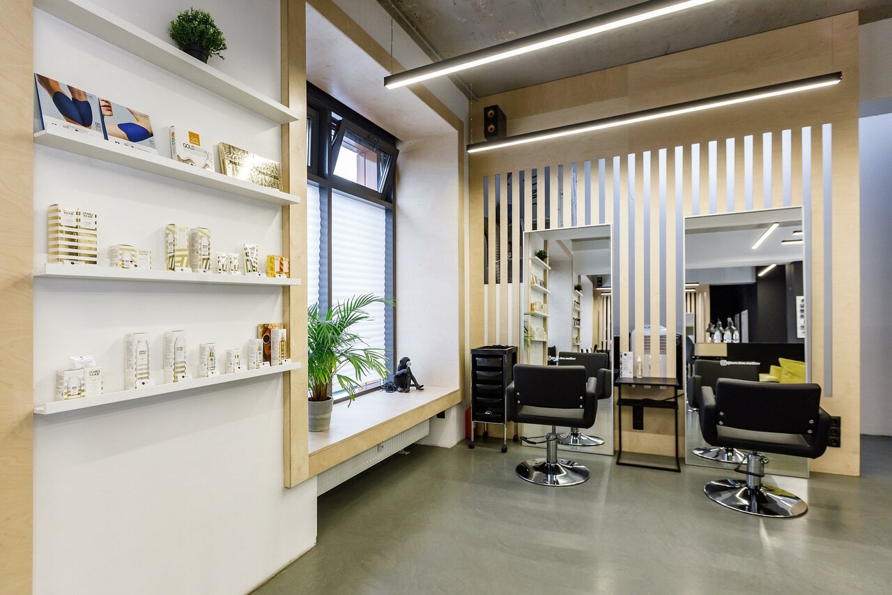 На первом этаже салона есть несколько зон: ресепшн, холл, маникюрный/бар и педикюрная. На цокольном этаже находится зона макияжа, парикмахерская, косметология, туалет и бытовые помещения.