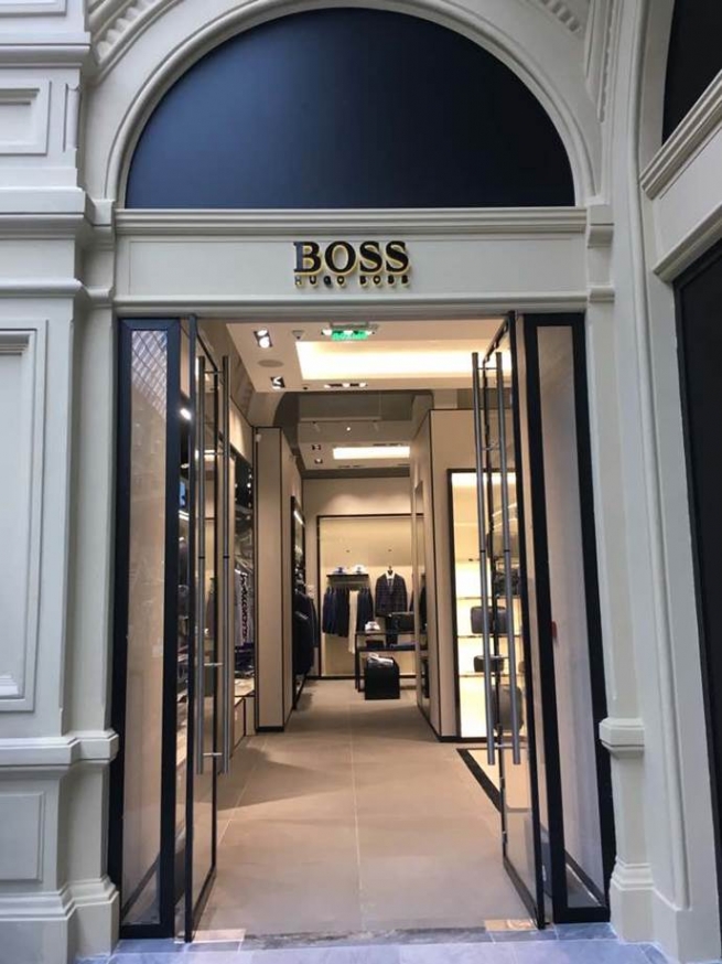 Грандиозная лестница из матовой нержавеющей стали ведет покупателей к обувному отделу и к большой витрине прет-а-порте, разработанной Гальяно, включая платья, меха и вечерние платья, и открывается захватывающий вид на самые знаковые достопримечательности Москвы.