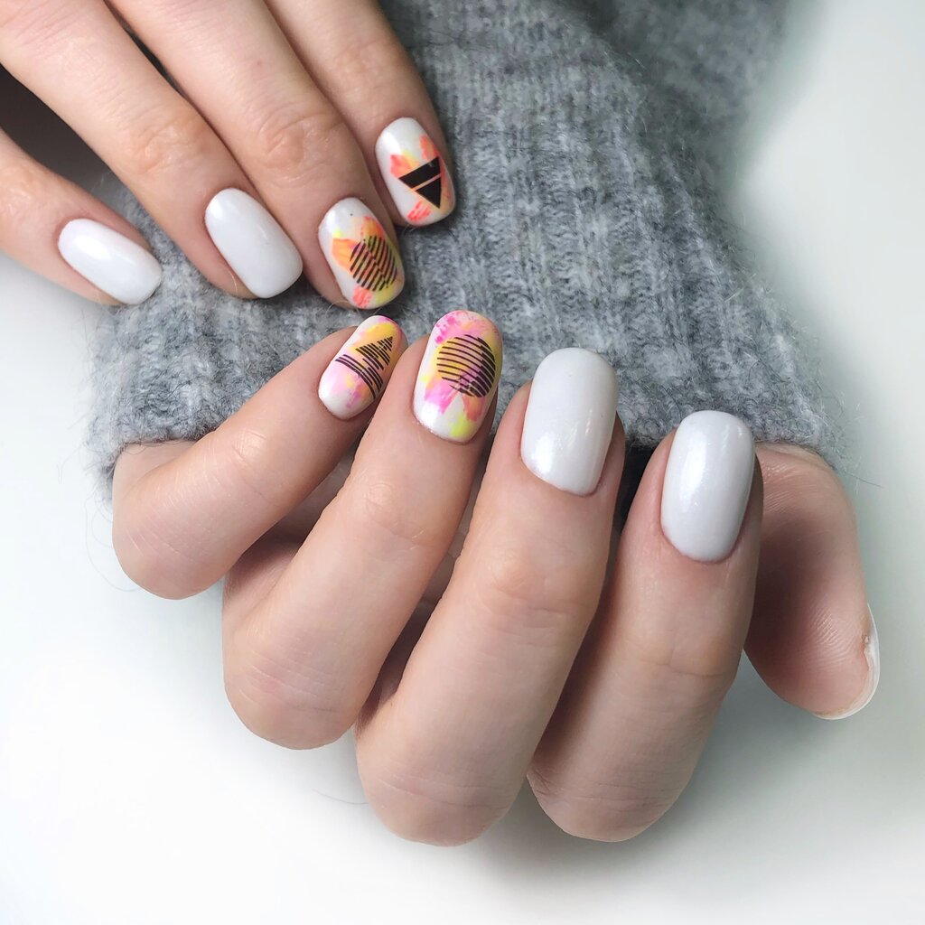 Ещё один вариант летнего дизайна. Для его исполнения понадобится скошенная кисточка вроде той, которой вы рисуете брови и стрелки на глазах. Вместо акриловых красок можно использовать разноцветные глянцевые лаки.