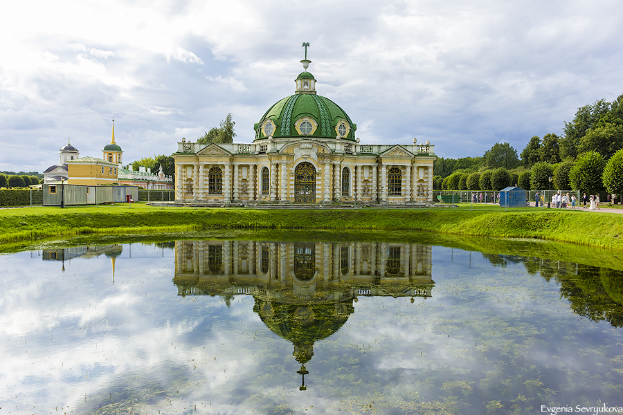 Среди всех парковых павильонов в Кусково наиболее привлекательным для посетителей является Грот – это такая небольшая беседка, построенный в 1755–1761 годах под руководством Федора Аргунова. Каменный павильон в стиле рококо щедро декорирован скульптурой в нишах, украшениями на фронтонах, львиными масками над окнами.