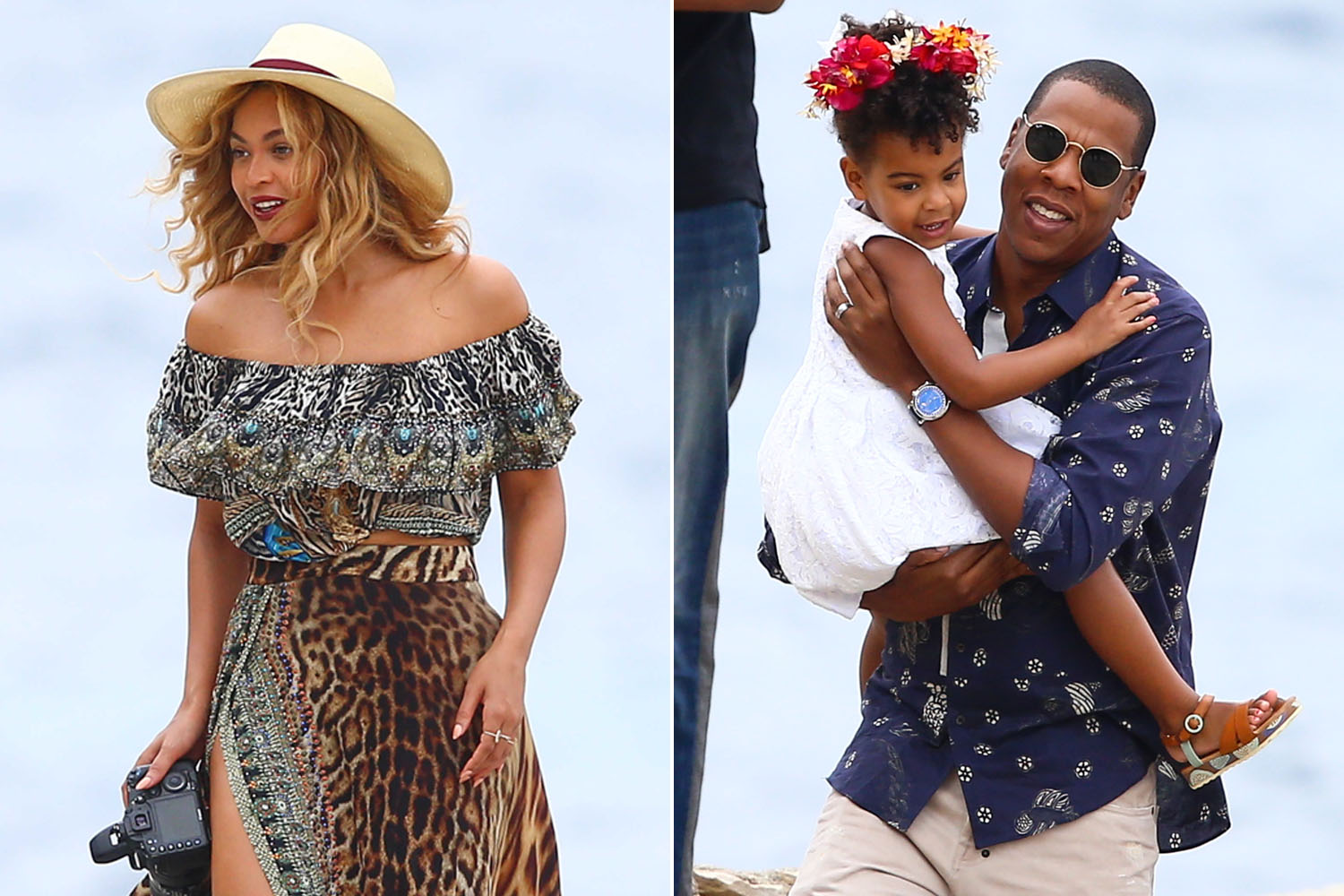 Бейонсе выглядела винтажной красавицей, когда ее светлые кудрявые волосы с перьями — которые напоминали Фарру Фосетт — развевались на ветру, и она улыбалась, когда ее сын принимал милую позу.