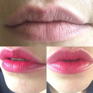 Косметику наносят на середину губ и вбивающими движениями кисти или пальцев растягивают к краям от центра.