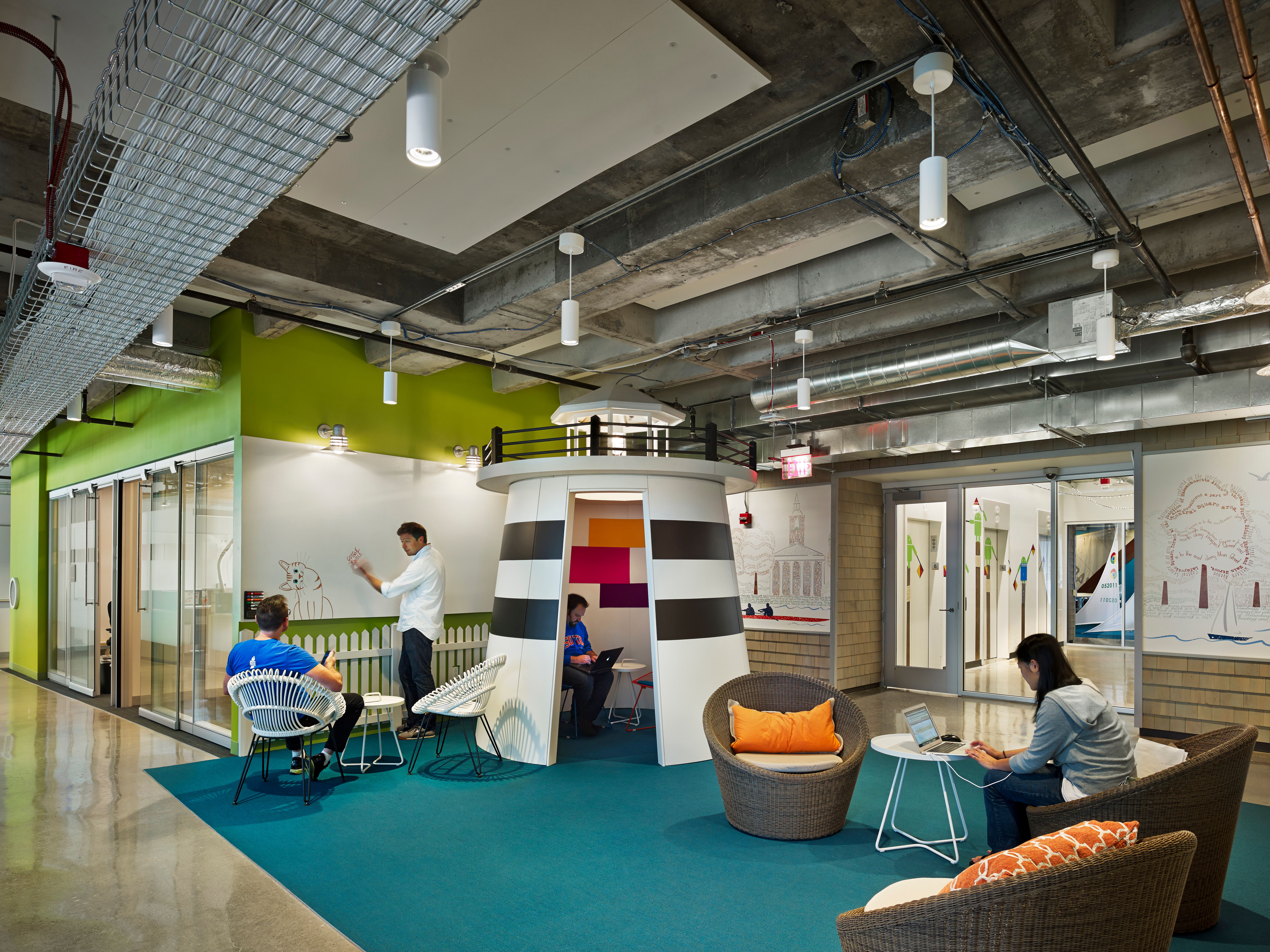 Офис предназначен для создания динамичной рабочей среды для совместной работы, которая поддерживает растущее число сотрудников Google. Есть разные места, где рабочие могут расслабиться и возобновить свою работу.