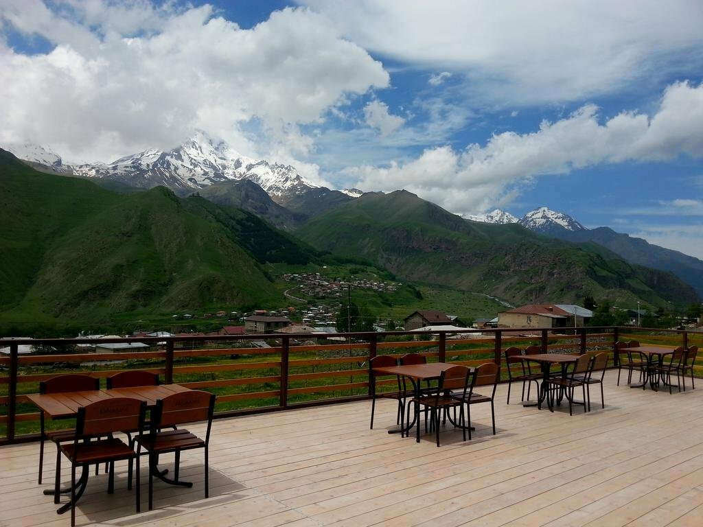 Отель Казбеги (Rooms Hotel Kazbegi)- находится у подножия горы Казбек в поселке Степанцминда, в 7 км от Троицкой церкви XIV века в поселке Гергети. Виды с террасы и окон отеля как на выставке. Покидать отель не хочется, хочется- жить на его уютной террасе и непрерывно смотреть на Казбек и Церковь святой Троицы. Пол в номерах деревянный, а вместо окон- стеклянные стены.