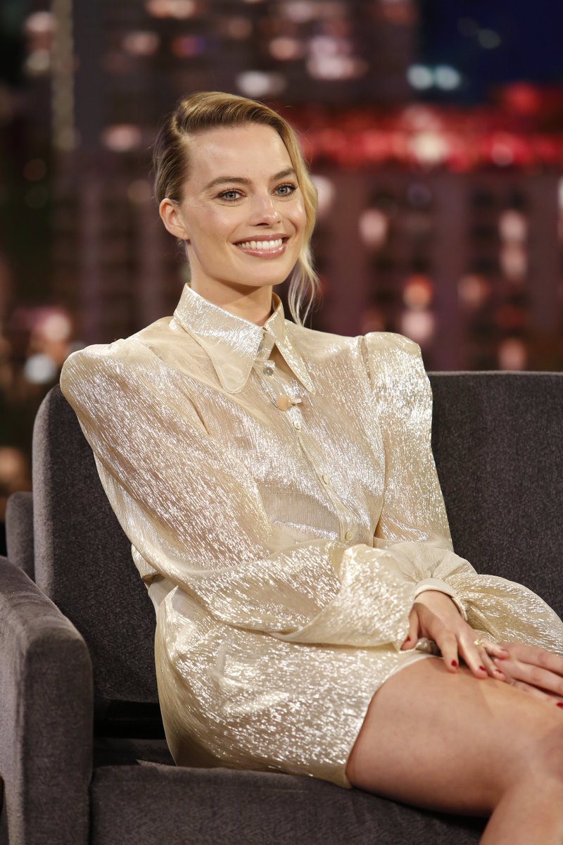 Робби спешила на эфир программы Jimmy Kimmel Live, но уделила внимание фотографам, поджидавшим ее у студии. Марго с улыбкой поприветствовала их и остановилась, чтобы они успели сделать фото. Для появления на интервью Робби выбрала мини-платье с широкой линией плеч Magda Butrym. Наряд с классическим принтом в горошек дополняла изящная драпировка в виде цветка розы. За образ актрисы отвечала стилист Кейт Янг.