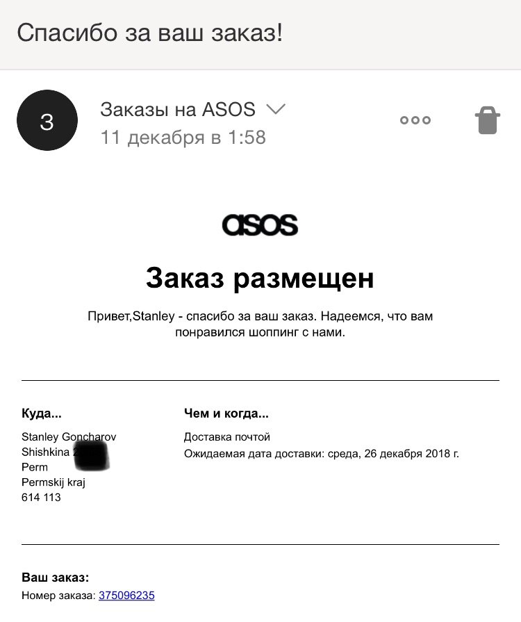 25.11.2021, спустя два (2!!!) месяца (!!!) мне на мейл пришло письмо от Asos, что они получили мой возврат, но я, якобы, не выполнила условие оформление возврата и оформила его после 28 дней, поэтому деньги они мне вернуть не могут, по их правилам, за возвраты с 28 по 45 день возвращают в виде подарочных сертификатов в их же интернет-магазине.