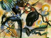 В период между 1911 и 1913 годами Кандинский подошел еще ближе, как это называется на выставке, к «грани абстракции». Его «Синий всадник», которого легко узнать в «Маленьких удовольствиях» 1911 года, в «Маленьких удовольствиях» 1913 года — лишь брызги краски. Он сделал «Этюды цвета», квадраты и круги чистого цвета. Он написал «Черные линии», в которых солнечные лучи красного, синего, зеленого и желтого цветов нарушены черными каракулями. «С тремя всадниками» и «Картина с белой каймой» показывают, что он освободился от цепких ограничений формы.Остались только цвета и линии, вспыхивающие, как кометы и новые звезды, во вселенной искусства.