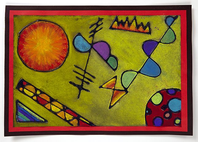 Кандинский написал эту работу на шестидесятилетнем возрасте, и она демонстрирует его поиски на протяжении всей жизни идеальной формы духовного выражения в искусстве. Эта работа, созданная как часть его экспериментов с линейным стилем живописи, демонстрирует его интерес к форме круга. «Круг, — утверждал Кандинский, — это синтез величайших оппозиций. Он сочетает в себе концентрический и эксцентричный в единой форме и в равновесии. Из трех основных форм он наиболее ясно указывает на четвертое измерение.Он полагался на различные возможности интерпретации круга, чтобы создать ощущение духовной и эмоциональной гармонии в этой работе. Разнообразные размеры и яркие оттенки каждого круга всплывают сквозь холст и уравновешиваются тщательным сопоставлением пропорций и цвета Кандинского. Динамичное движение круглых форм вызывает их универсальность — от звезд в космосе до капель росы; круг — неотъемлемая часть жизни.