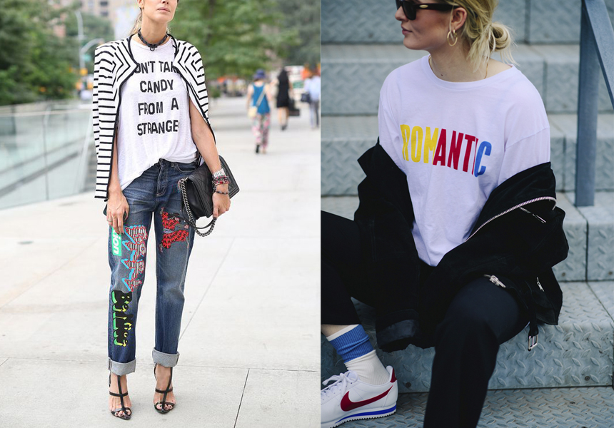 С чем носить предметы женского гардероба с надписями и вензелями? Не стоит искать сложные сочетания, используйте простые решения для создания оригинального образа.
