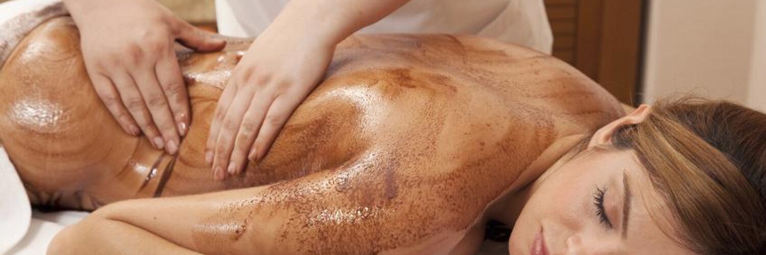 Для работы мастер применяет силиконовую перчатку, которой наносит скраб на тело и аккуратно массирует кожу, втирая состав. Затем смесь смывают, тело покрывают питательными маслами.
