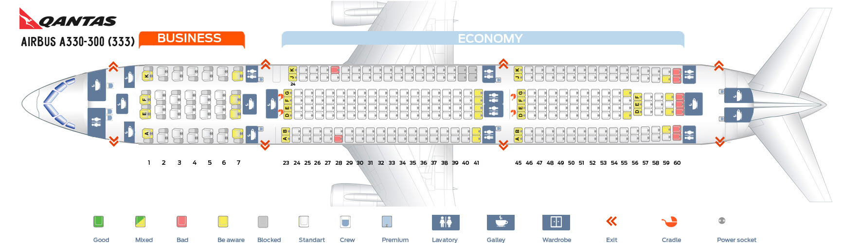 1-5 (1-2) ряды отданы местам бизнес-класса. В данной модели самолетов, в отличие от тех же А330, расстояние между рядами ограничено. Первый ряд отличается от других. Среди его особенностей: