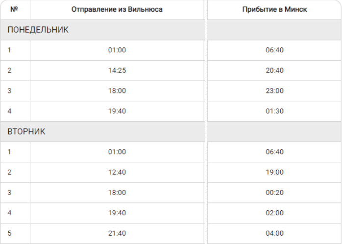 Выдержка из расписания автобусов Минск — Аэропорт