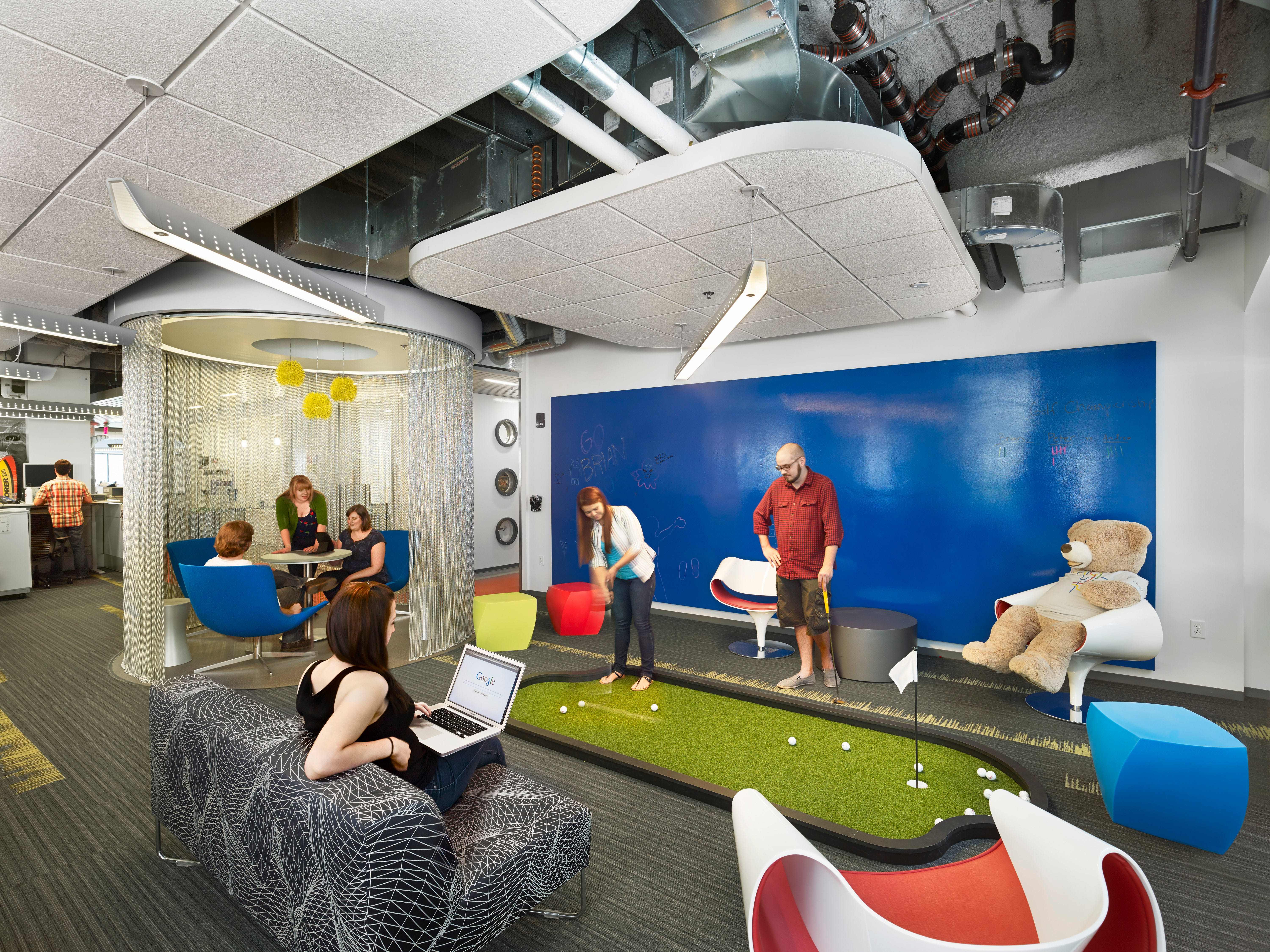 7. Основной идеей канадского офиса Google в Торонто стало движение. Пространство оборудовано так, чтобы сотрудники проводили больше времени, перемещаясь по помещениям. А на балконе офиса можно сыграть в мини-гольф.