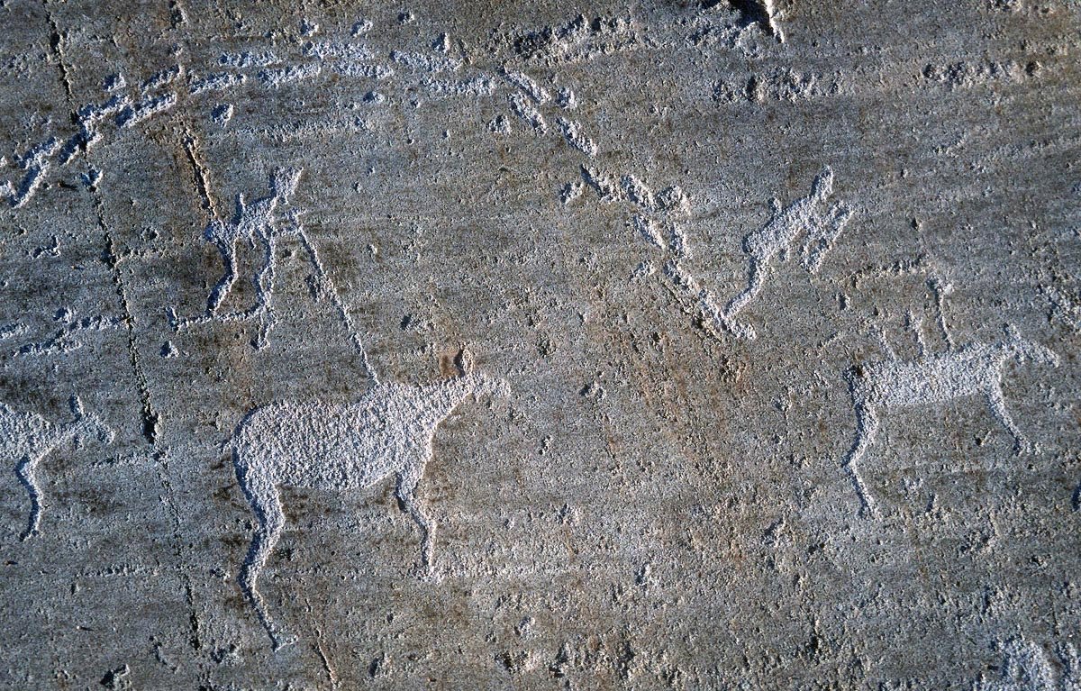 Петроглифы Залавруги, изображающие стадо лосей (справа) и лучника (слева)
