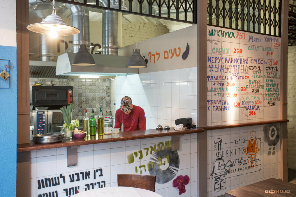 Два месяца новое помещение пустовало, пока не сложилась израильская концепция. Правда, насчёт Израиля громко сказано: в «Бекицере» кашрут не соблюдают, здесь нет пряной израильской кухни с её кубэ, джахнуном и харирой. Зато есть открытая кухня и барная стойка посреди зала — дань «Терминалу».