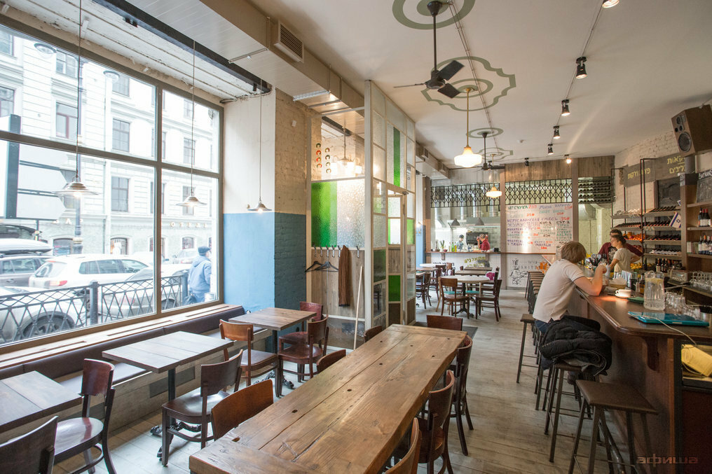 До появления названия мы понимали, что делаем заведение, аналогов которому нет ни в Питере, ни в Москве. И что и тут, и там существуют еврейские и израильские организации, все закрытого типа, они работают с диаспорой, а общество об этом ничего не знает. Мы понимали, что создаем концепт, который должен открыть эту культуру. У многих мировых культур и кухонь есть представительства, они известны народу. Например, грузинскую кухню и культуру любят многие из тех, кто никогда не бывал в Грузии, индийская, японская кухня — то же самое. Еврейские рестораны были в Питере, а израильских — до нас — никогда. Идея была в том, чтобы познакомить людей с этим явлением: это тоже культура, самобытная, колоритная. У нас 96 квадратов, из них 20 — кухня, остальные — зал, еще есть подвал, где склад и часть заготовок. И вся эта площадь фактически живет как в Израиле.