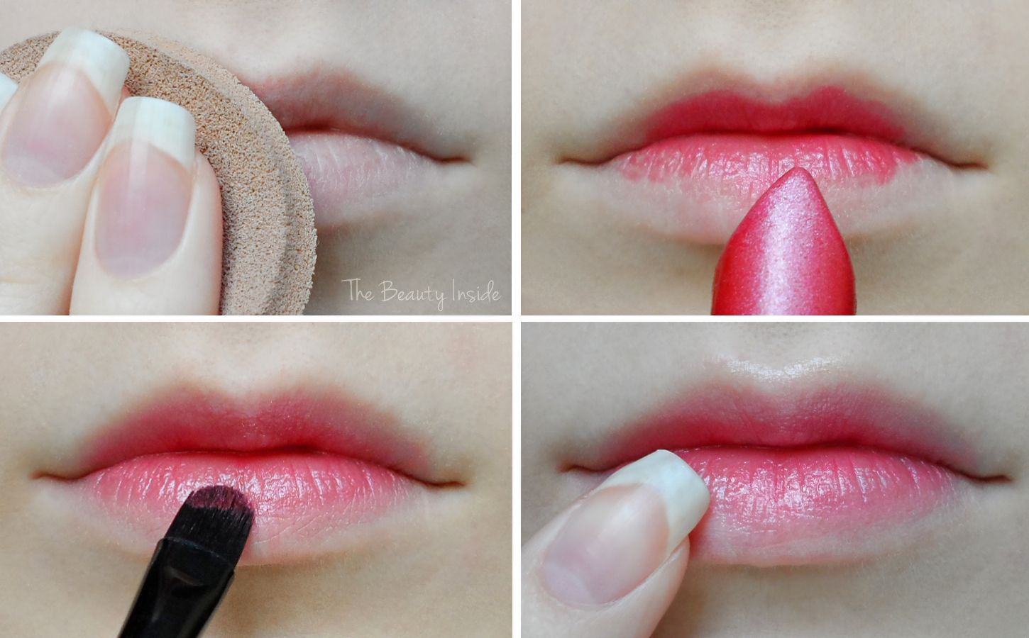 После этого сожмите губы и постучите подушечкой сверху. Вы можете использовать тональную основу-кушон с легкой текстурой, которая легко ложится на ваши губы. Если вы обнаружите, что контраст слишком резкий, вы можете добавить больше цвета в центр ваших губ, а затем использовать кисть для губ, чтобы растушевать его по направлению к краям, чтобы цвет смягчился и получился лучший вид градиентных губ, как у кореянок.