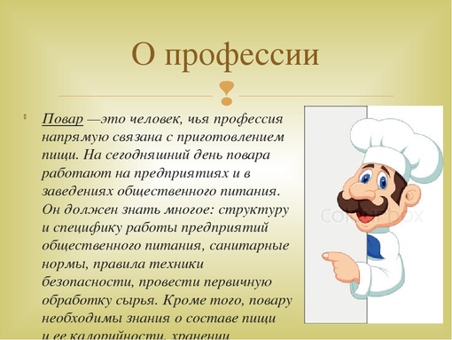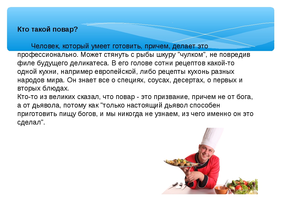Плюсы и минусыЗарплата на 03.05.2021Повар — это специалист по приготовлению пищи. Хорошего повара иногда называют волшебником, ведь он может из самых обычных продуктов приготовить настоящий шедевр, который доставит радость и наслаждение людям. Кстати, в 2021 году центр профориентации ПрофГид разработал точный тест на профориентацию. Он сам расскажет вам, какие профессии вам подходят, даст заключение о вашем типе личности и интеллекте.