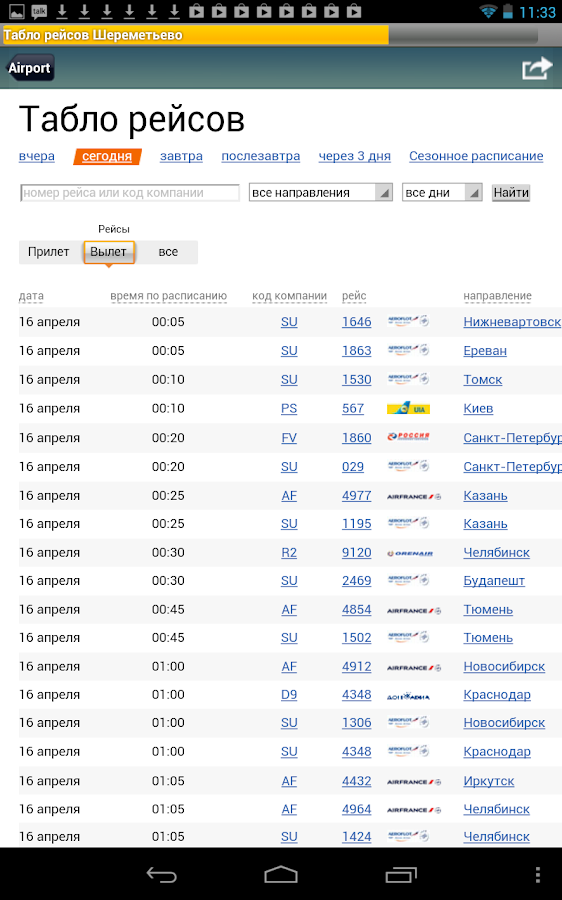 Онлайн табло аэропорта Шереметьево вылета и прилета рейсов на сегодня и на завтра. Интерактивное табло аэропорта в режиме реального времени отображает информацию по международным и внутренним рейсам: номер авиарейса, название авиакомпании, маршрут рейса, время отправления или прибытия по расписанию.