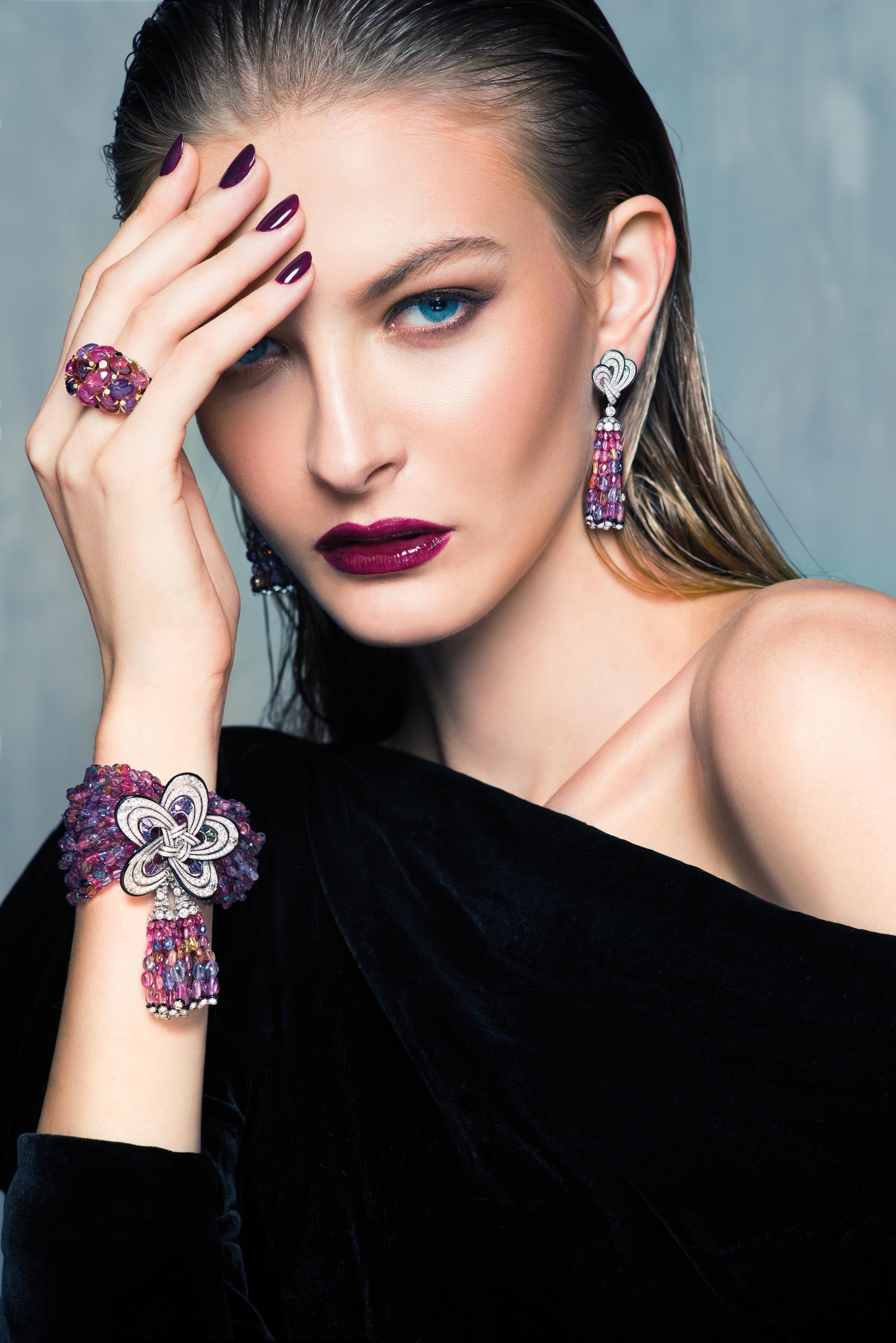 В экспозиции он представлен в окружении украшений Cartier с восточными мотивами, в том числе колье в индийском стиле из 18 рубиновых и алмазных плакеток, нанизанных на 360 жемчужин в пяти нитях.
