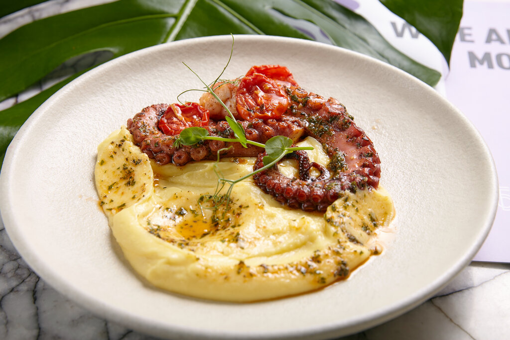 Контролируйте себя уже на входе, где на прилавке торжествуют знаменитые на весь Петербург эклеры: красный бархат, лесной орех, кокос, черника, шоколад и ваниль ― невозможно решить, на каком вкусе остановиться.Сладкой жизнью дело ни в коем случае не ограничивается: в первом кофейно-плюшечном зале начинается открытая кухня, где жарит мангал, печет печь, как белки в колесе лавируют повара да аппетитно сияют начищенные сковородки с котелками. Мраморная столешница пестрой лентой уходит в зал дальний, где полыхает живой огонь, ретро-кресла и охристые диваны устроились вокруг столов с латиноамериканским орнаментальным узором. Дизайн ресторана создавало агентство Megre Interiors, высоко оцененное как в России, так и на международной арене. И эта утончённая красота продолжается и в тарелках.