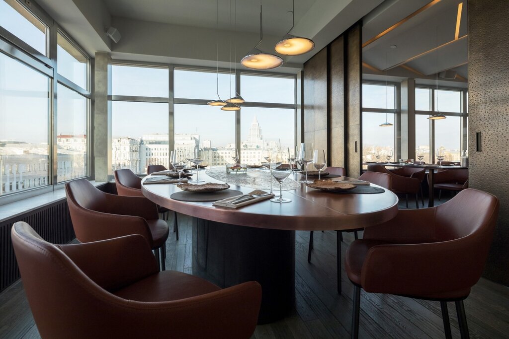 Дизайнер Екатерина Валц великолепно украсила это роскошное заведение.Она известна своим стильным минималистичным интерьером. По правде говоря, такое удивительное пространство сложно испортить. Из панорамных окон открывается один из лучших видов в Москве, благодаря прекрасному расположению.