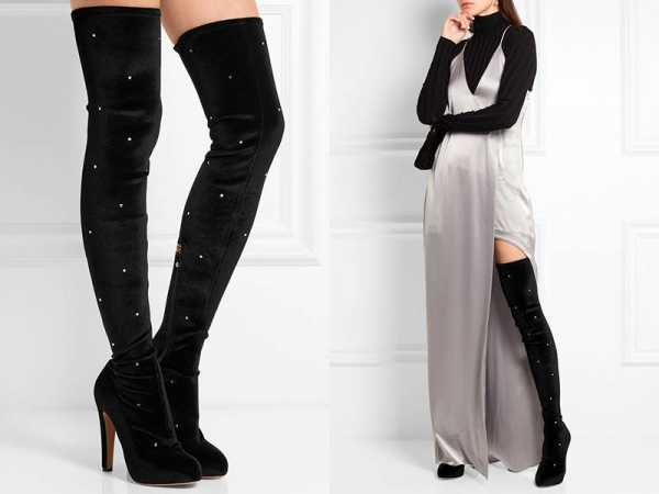 Из самого названия не сложно понять — как выглядит данная обувь. Длина их может быть чуть выше колен, а может доходить до самого верха бедра. Выполнены они, как правило из мягких, часто – натуральных, материалов, которые хорошо сидят на ноге и дарят ощущение комфорта. Но, это в случае, если Вы совершаете качественную покупку. А вот дешёвый товар может деформироваться и «съезжать» во время носки, заставлять ноги потеть и доставлять ещё массу неприятностей. Так что в данном случае, экономить совсем не стоит. Сапоги шьются из замши и кожи, но встречаются тканевые и комбинированные варианты.