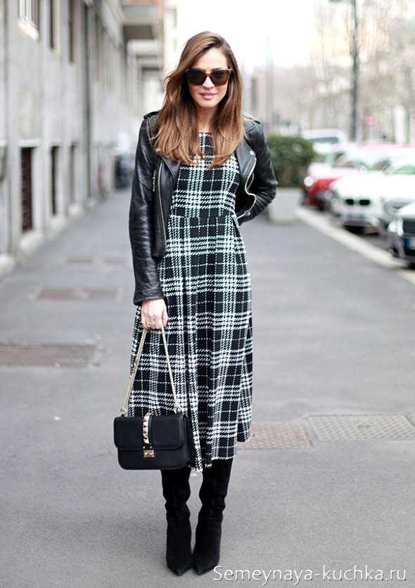 Самый важный момент при выборе платья – это длина. В комплект к высоким сапогам, достигающим середины бедра, следует выбрать платье длиной до верхней кромки сапог или немного ниже. Если сапоги имеют классическую длину – чуть выше колена, то можно надеть платье, подол которого будет сантиметров на 10 выше кромки сапог.