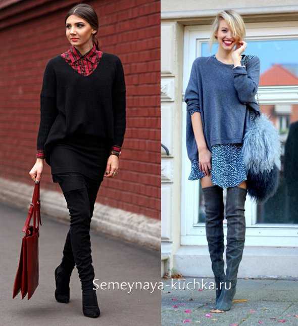 — Удлиненный свитер или туника. Для большей эффектности используйте дополнительно шарф или пояс. Ткань туники может быть и легкой, и плотной. Облегающие сапоги отлично будут выглядеть со свитером оверсайз. Комбинирование свободного верха и облегающей обуви — супер-стильный лук!