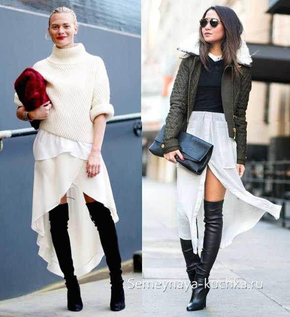 Вместо юбки вы можете одеть длинные тонкий сарафан, платье рубашку – главное услови наличие разрезов, через которые бы проглядывали сапоги-чулки. Потому что если их просто одеть с длинной летящей юбкой – но без вырезов – то мы просто закроем красоту чулок этой занавеской.