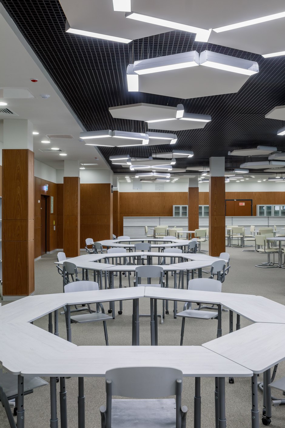 А чтобы заниматься с несколькими классами одновременно, в зале установлен разделительный занавес на электроприводе — он отделяет одну зону от другой. В школьной столовой будет не один, а сразу два обеденных зала. Для младших классов — на 400 мест, для старшеклассников — на 800 мест.