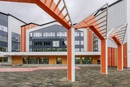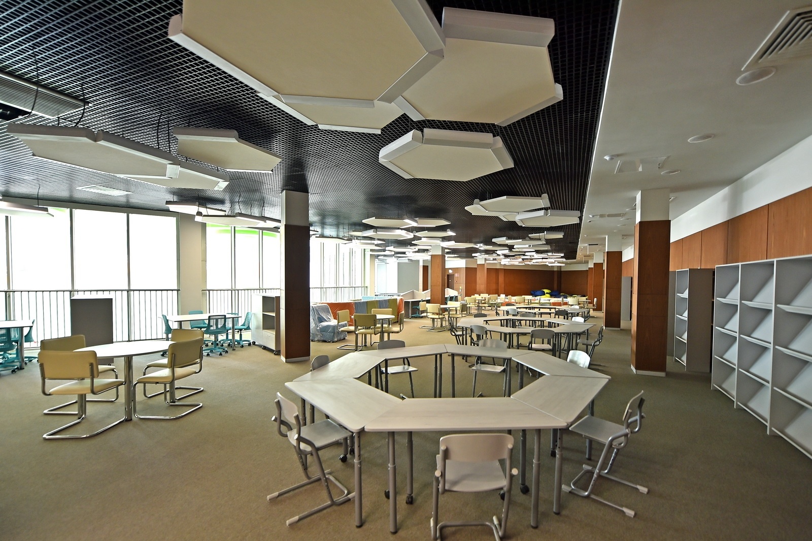 Огромное четырехэтажное здание новой школы состоит из блоков: блок начальной школы, блок основной и старшей школы и культурно-спортивная зона. Для начальной и старшей школы обустроили отдельные внутренние дворы с площадками, где можно побегать, заняться спортом или просто отдохнуть. В школе смогут учиться дети с нарушениями опорно-двигательного аппарата: здесь есть шесть лифтов и удобные пандусы по всей территории.