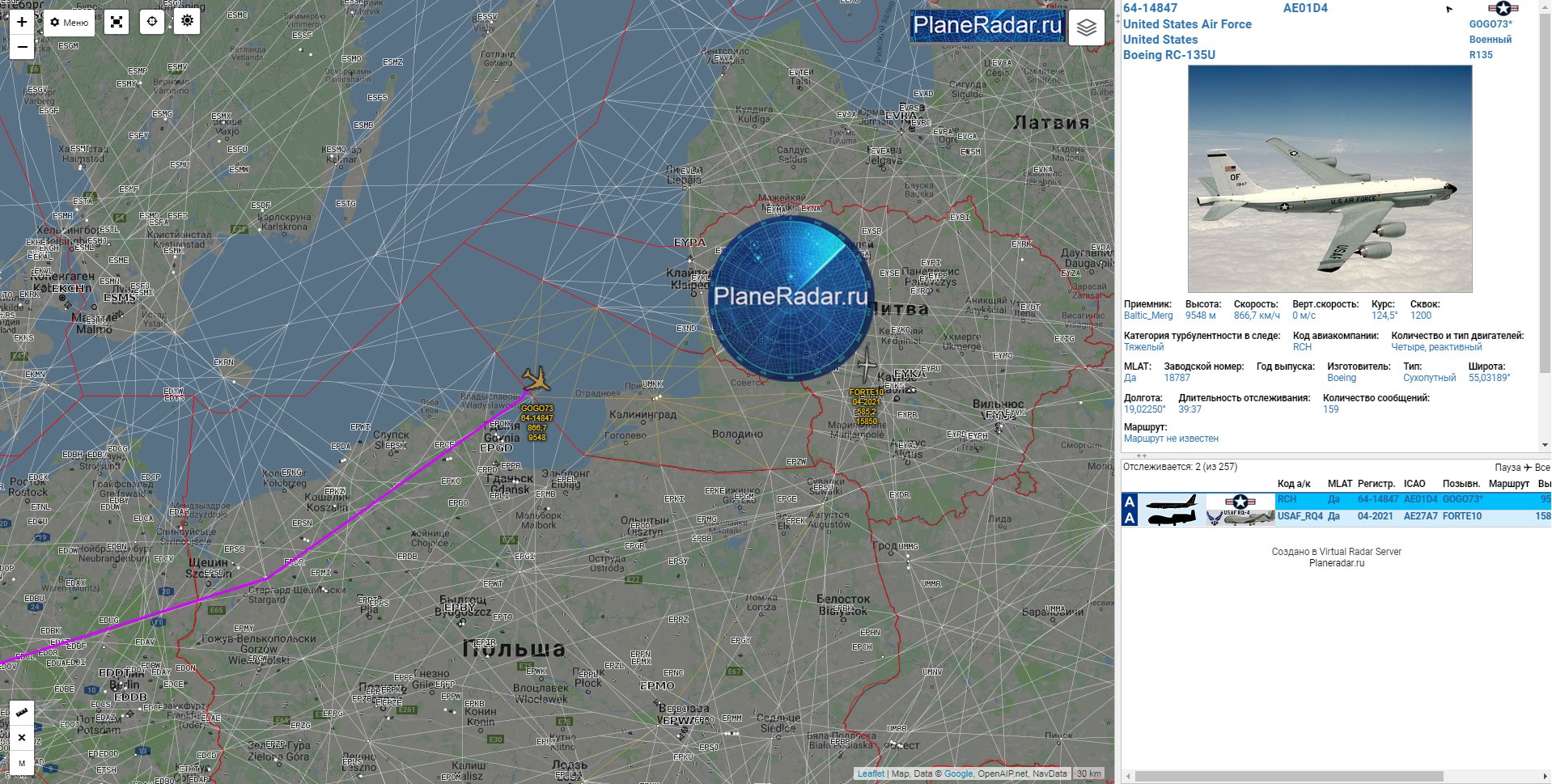 Информация в дальнейшем будет обновляться каждые нескольких секунд, перемещая самолет по карте.