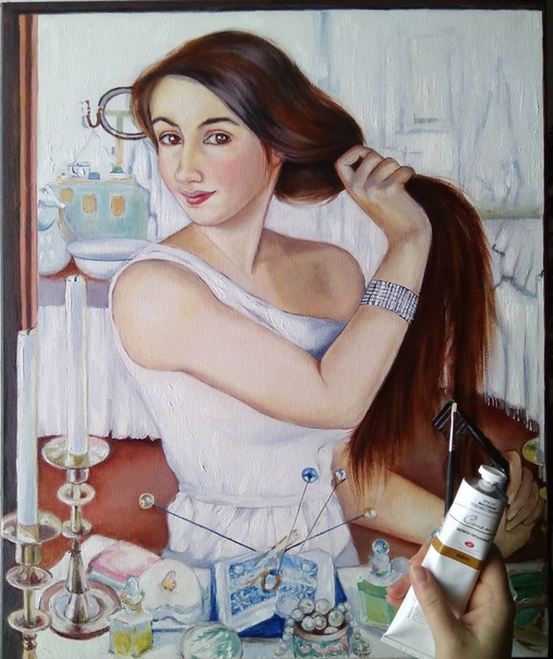 В разрезе жизни художницы эта работа имеет еще большее значение. Молодая девушка на картине только что проснулась и оказалась на пороге собственной жизни. Ей невероятно интересно, что принесет грядущий день? Какие события вот-вот произойдут, когда она закончит причесывать волосы? Темные проницательные глаза с интересом вглядываются в зеркало. Предвидят ли они грядущие исторические катастрофы и ломаные линии судьбы?