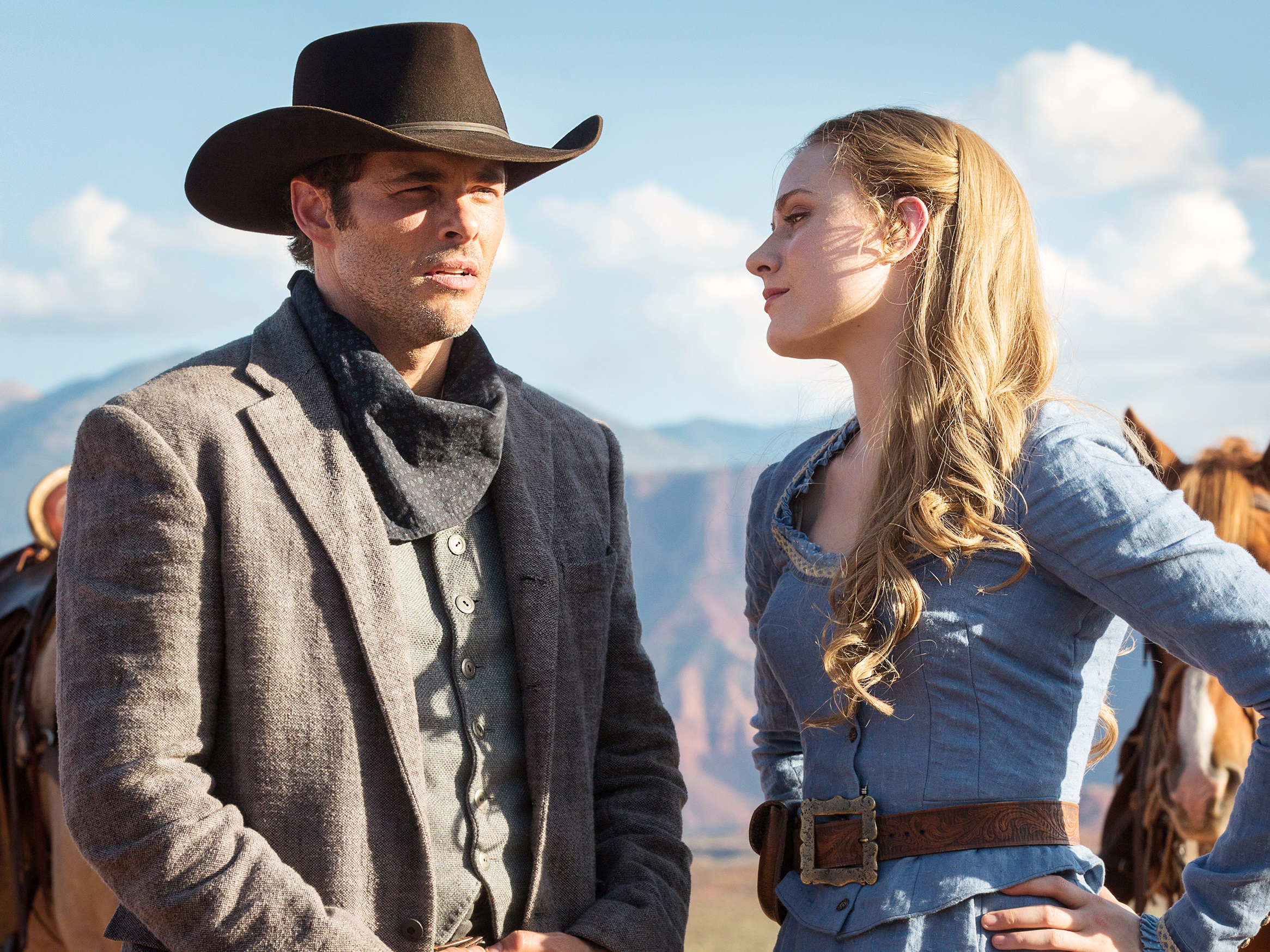 Джеймс Марсден и Эван Рэйчел Вуд в фильме «Мир Дикого Запада», премьера которого состоится в октябре.2.