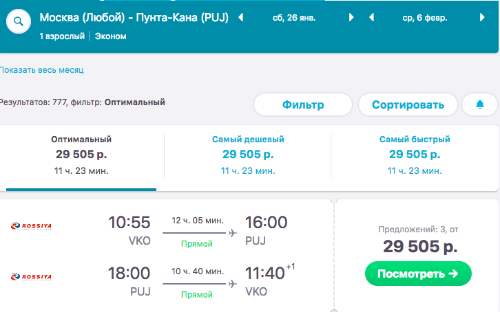 2) Самые дешевые рейсы MOW — PUJ доступны в среду и четверг. По выходным цена обычно выше.