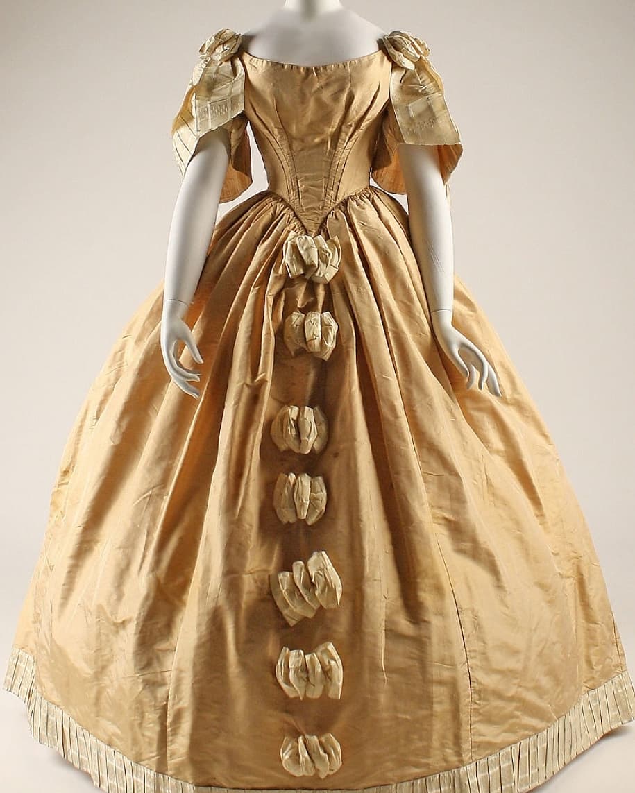 широкий вырез и приспущенные плечи.В последующие десятилетия верхняя юбка была отодвинута назад и