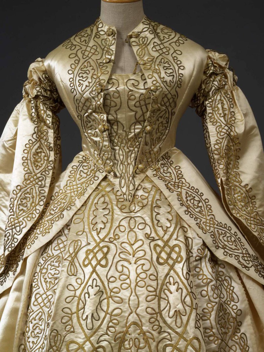 Наряды того времени отшивались из благородных парчовых или шелковых тканей и украшались при помощи витиеватых узоров, которые вышивали золотистыми или серебристыми нитями.