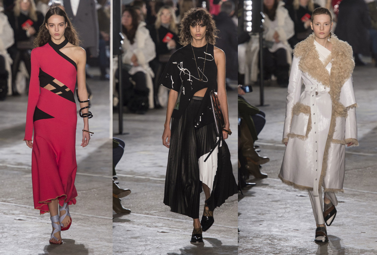 Бизнес встречает удовольствие на взлетно-посадочной полосе Дион Ли и Александра Ванга, где костюмы для работы были небезопасны. Асимметричный вырез, очень короткие подол и вырез под грудью сделали осенний костюм более подходящим для вечернего выхода.