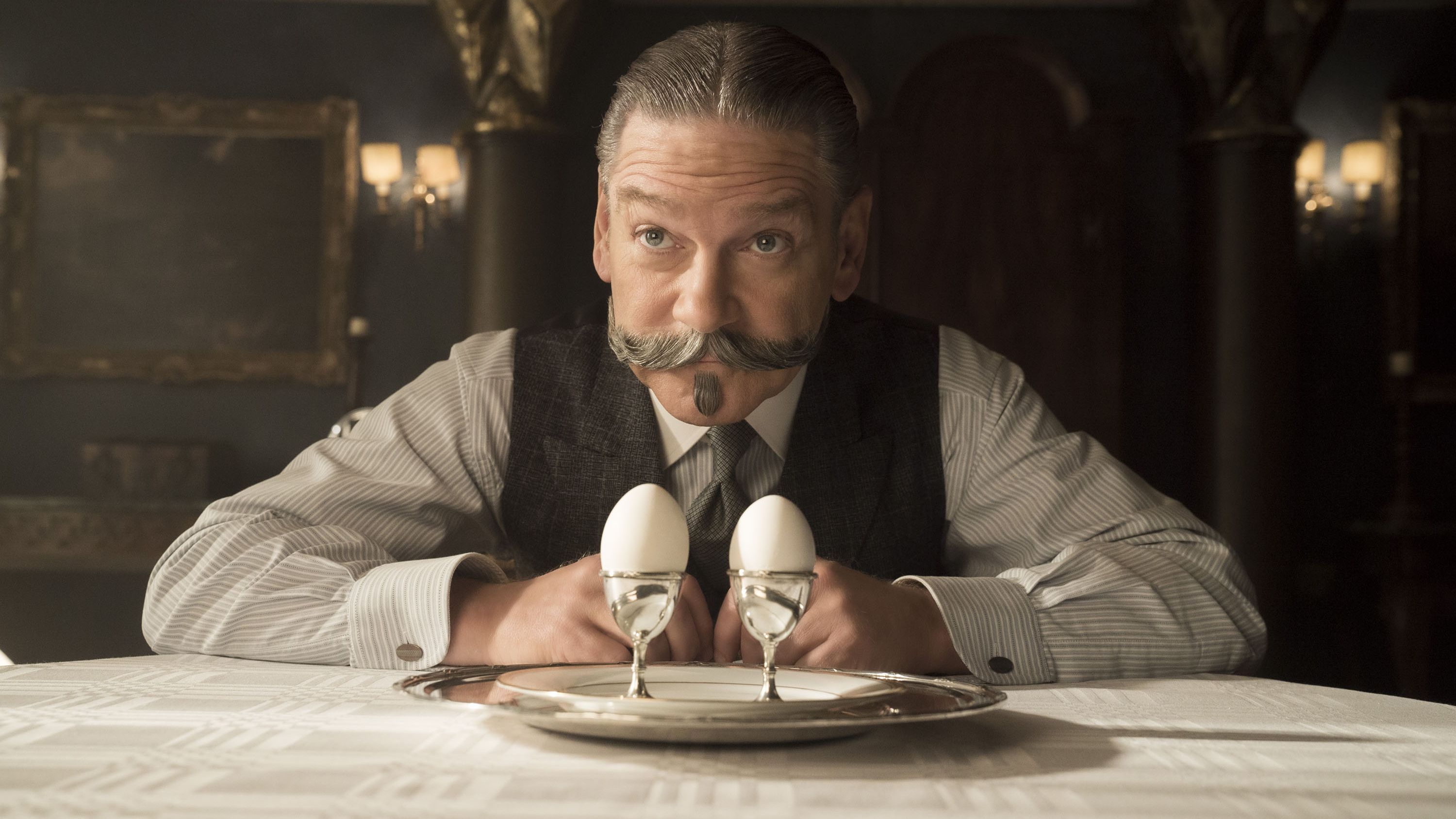 Пуаро Брана представлен как привередливый детектив, который требует, чтобы его яйца всмятку не отставали друг от друга по высоте; это повышенное внимание к деталям явно служит ему как величайшему сыщику в мире, и его репутация опережает его, куда бы он ни пошел. На борту «Восточного экспресса» он намеревается немного отдохнуть, но к нему подошел Рэтчетт (Депп), который представился как торговец произведениями искусства, который недавно попал в горячую воду, когда сомнительная сделка провалилась.Рэтчетт хочет нанять Пуаро, чтобы тот защитил его; Пуаро отказывается.
